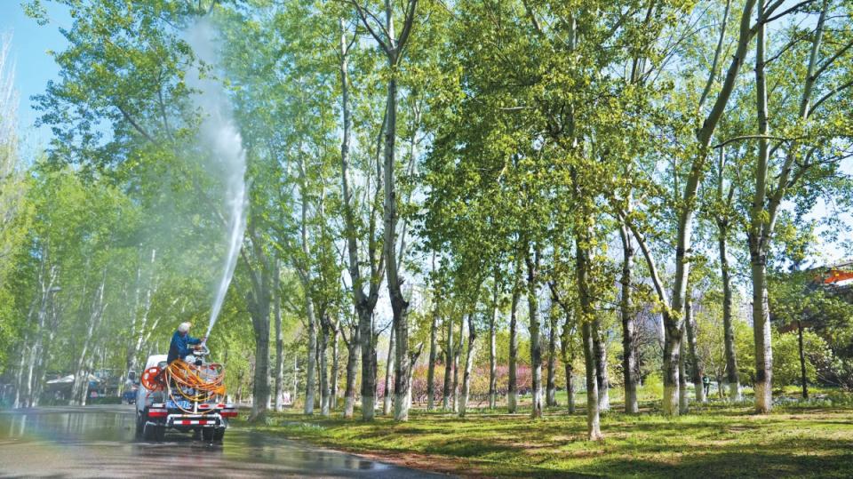 昨日,在奥森公园北园,园林工人在清洗车的水箱中注入了今年首次研发投用的“凝絮剂”,随后开启高压水枪对杨树进行喷洒。