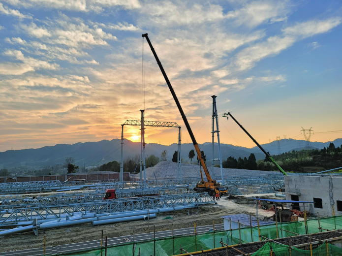南川500千伏开关站正在进行第一组品字形构架吊装(摄影/唐沁村)
