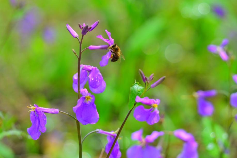 小蜜蜂循着花香而来,在花丛中翩跹起舞,紫花、绿影、蜂鸣相映成趣。