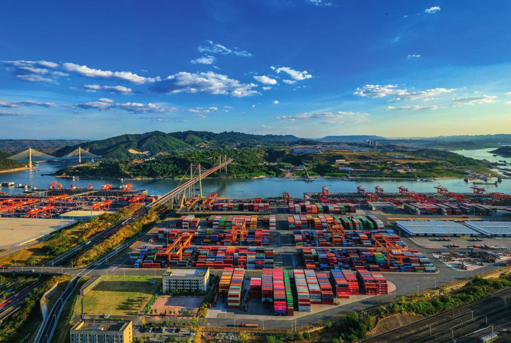 蓝天白云下的果园港,集装箱整齐有序地摆放在港口等待吊装(摄影 龙帆 视觉重庆)